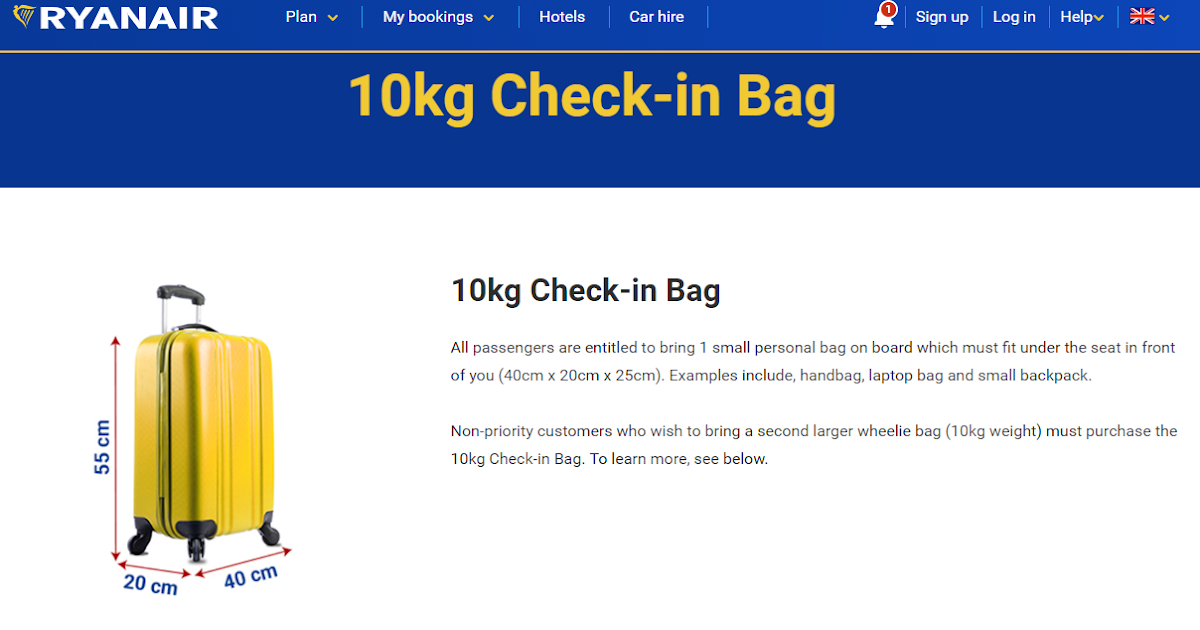 Ryanair cabin bag size measurements. Check spelling or type a new query. Maybe you would like to learn more about one of these? We did not find results for: